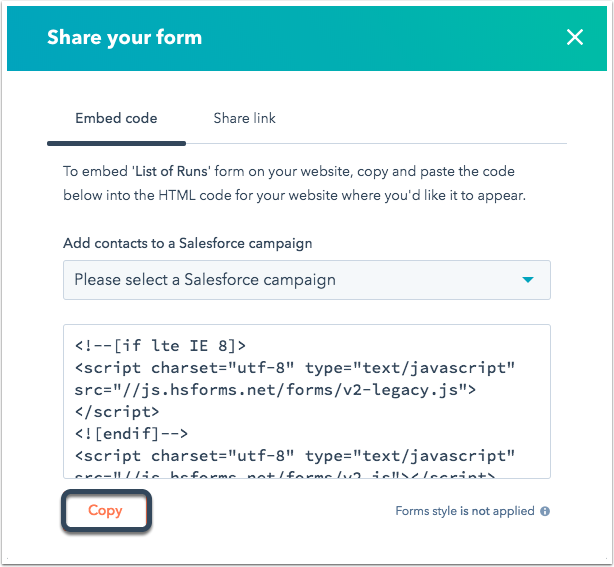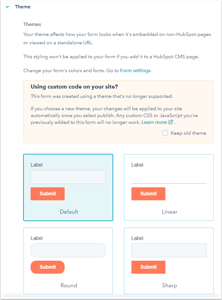 Please note: clearing the Keep old theme checkbox will remove the former default HubSpot styling applied to this form. Any custom CSS or JavaScript you have added to the form will no longer work. This checkbox is only available for legacy forms and will not be available in any new forms created in your account.